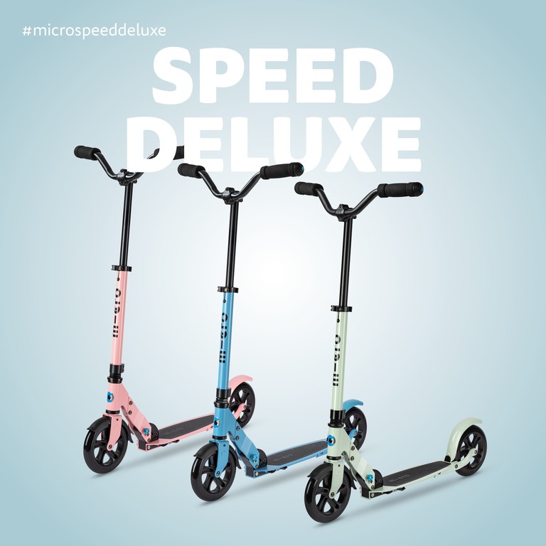For children from 7 years old to teens and adults Max Load: 100 kg Two wheels Wheel size: 180mm Wheel Material: PU Wheel Hardness: 83 Shore A Wheel Bearing: ABEC 9 Deck Size: 120x340mm Deck Material: Aluminium, Non-slip sandpaper coating Tbar Height: 78-101 cm Tbar Foldable & Adjustable Product Weight: 4,5kgThe Micro Speed Deluxe is light, agile and fast - the perfect everyday companion for teens and adults. The large wheels with a diameter of 180 millimetres ensure a smooth ride, even on rough surfaces. In addition, the trendy aluminium scooter with its cool chopper handlebar has a mudguard at the front and rear to reliably protect you from dirt and water splashes. The Micro Speed Deluxe can be stored compactly for transportation in the bus, train or car.