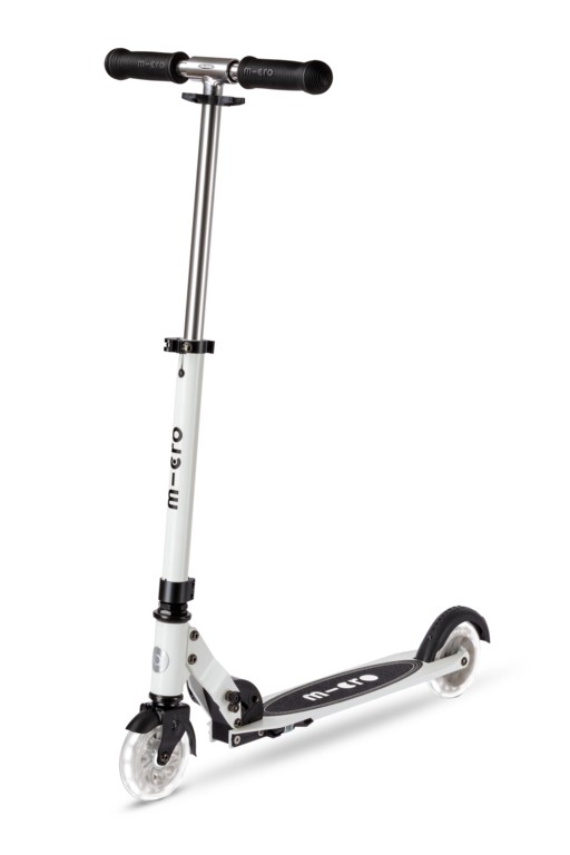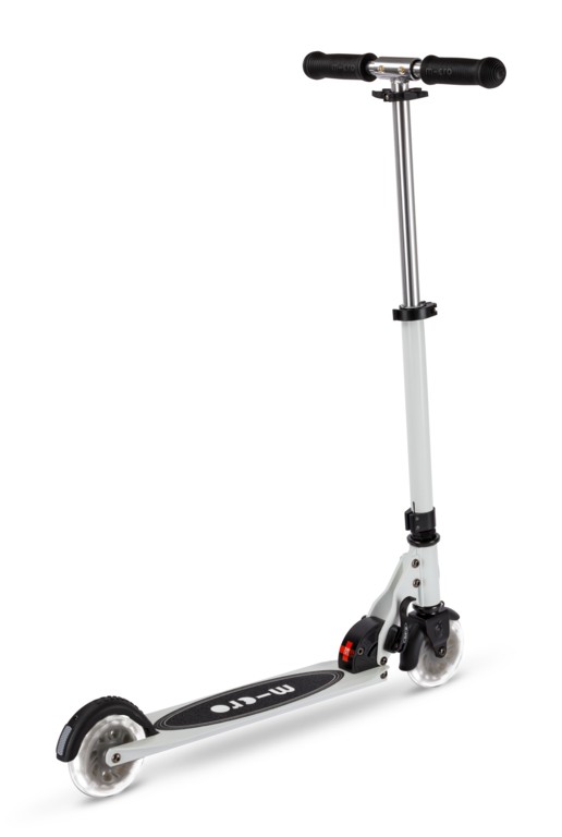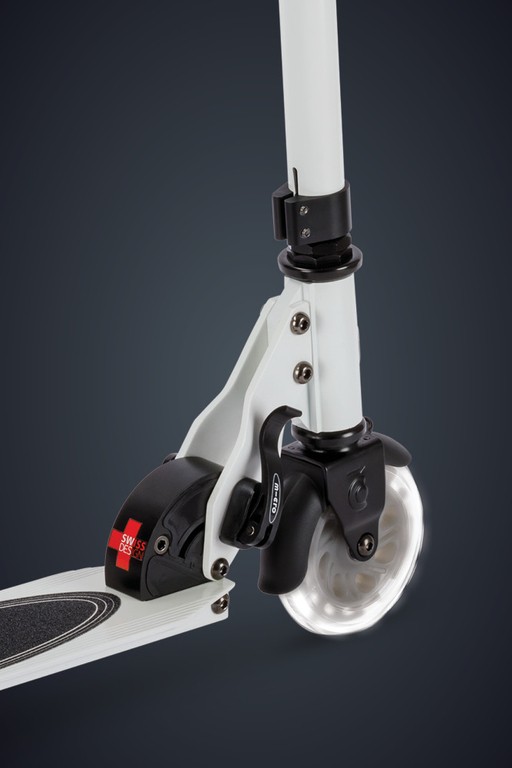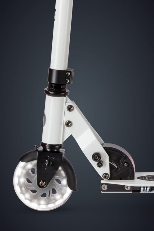 For children from 5 years old to adults Max Load: 100 kg Two wheels Wheel size: 120/120mm Wheel Material: PU Tbar Height: 66cm - 95cm Tbar Foldable & Adjustable Product Weight: 3.1 kg Available colours: White Swiss designSparkle on the Go - Light Up Every Ride!